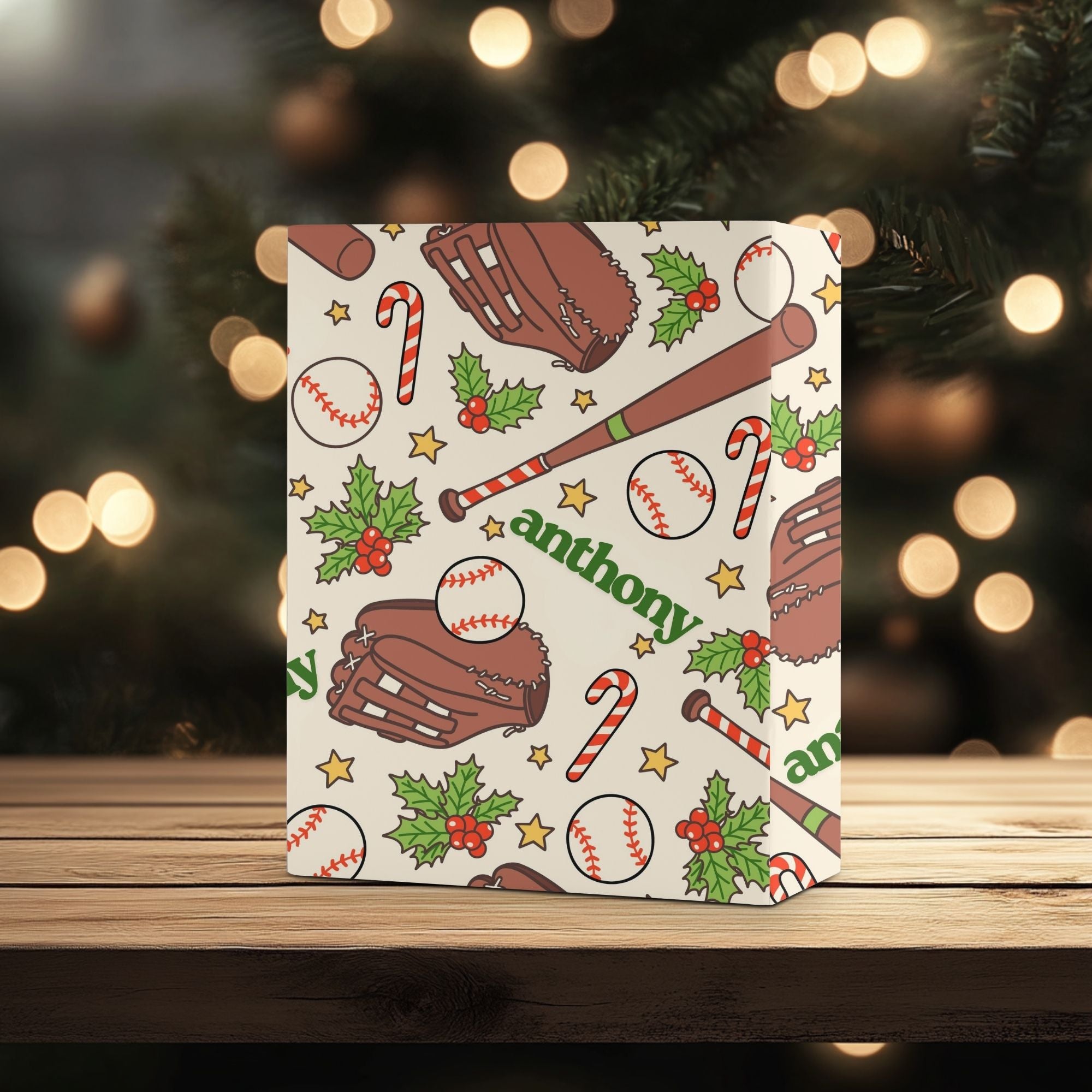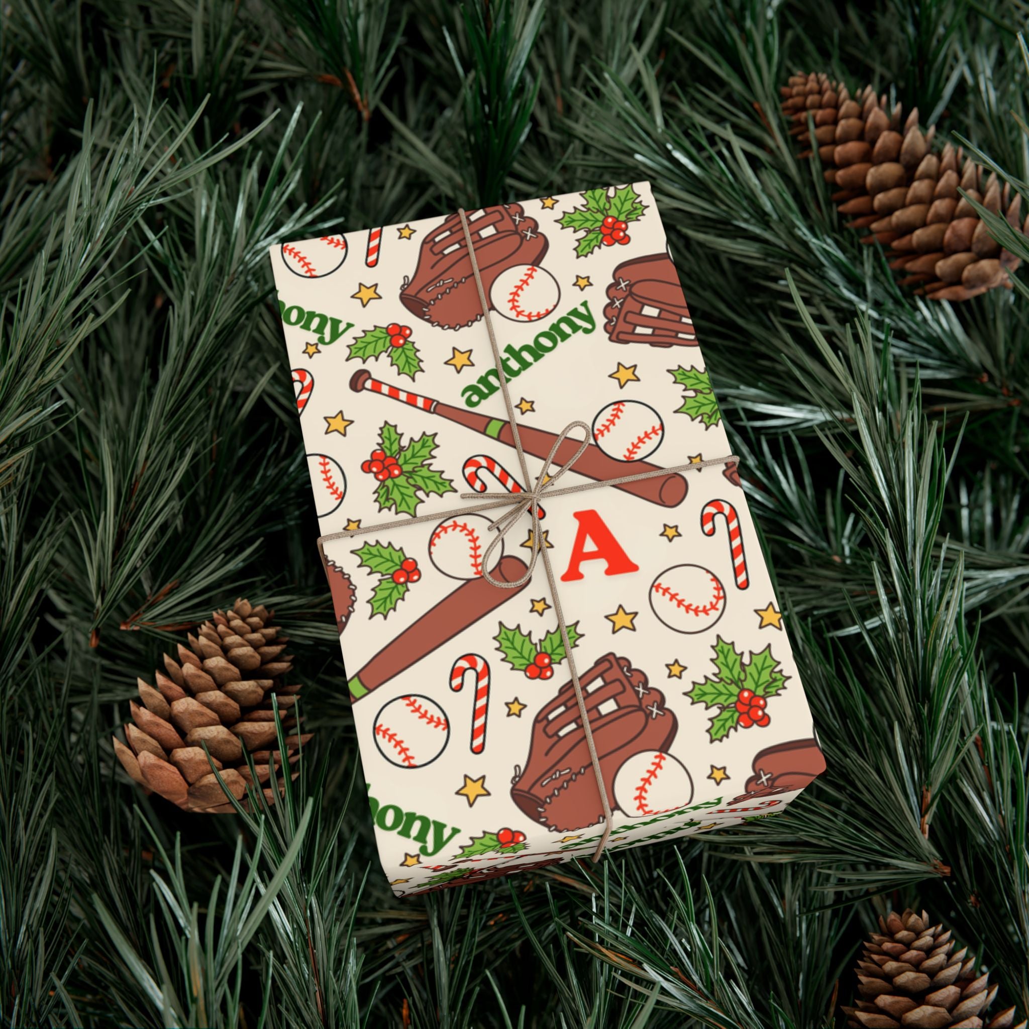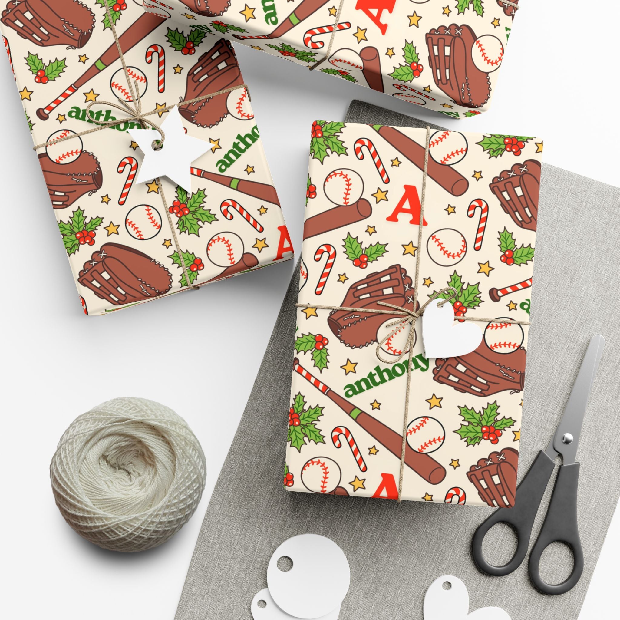 Baseball theme Christmas wrapping paper personalized with a name, perfect for adding a special touch to your gifts. Ideal for sports enthusiasts and those looking for unique holiday wrapping paper.