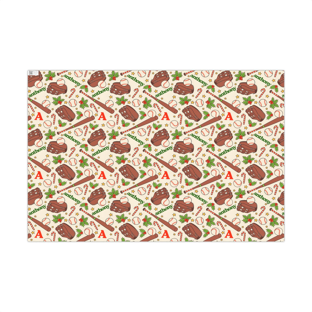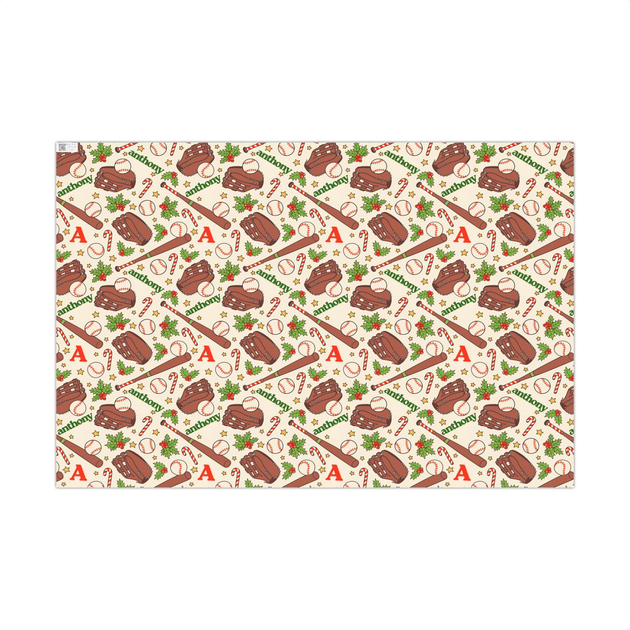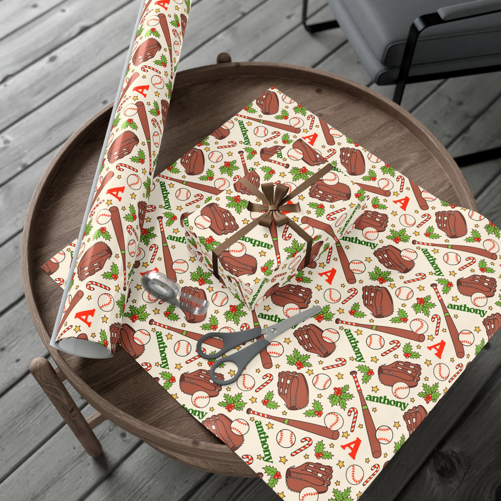 Baseball theme Christmas wrapping paper personalized with a name, perfect for adding a special touch to your gifts. Ideal for sports enthusiasts and those looking for unique holiday wrapping paper.